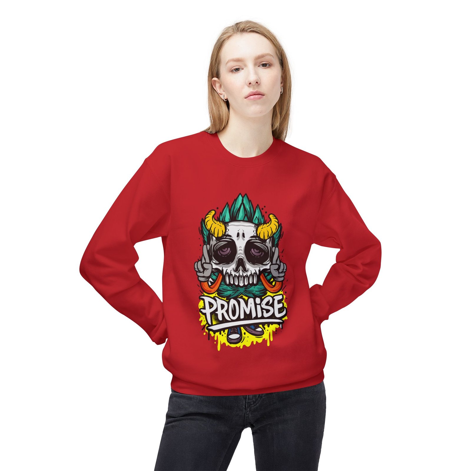 Add a touch of personality and comfort to your wardrobe with the Promise Skull Crewneck Sweatshirt. This unisex fleece sweatshirt is designed to make a bold statement with its unique, vibrant skull design. The relaxed fit, combined with the soft fabric, makes it perfect for casual outings, skate culture events, or cozy nights in. Whether you’re chilling with friends, attending a festival, or just out for a casual day, this crewneck sweatshirt offers the perfect blend of style and comfort.